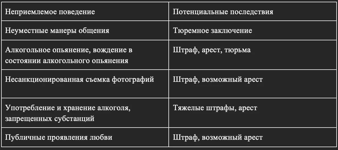 ● Неуместные манеры общения: Публичное проявление жестов, которые могут быть интерпретированы как оскорбительные или унизительные, может стать основанием для ареста и последующего тюремного заключения. Необходимо всегда общаться с уважением и поддерживать достойное поведение, чтобы предотвратить возникновение конфликтных ситуаций.